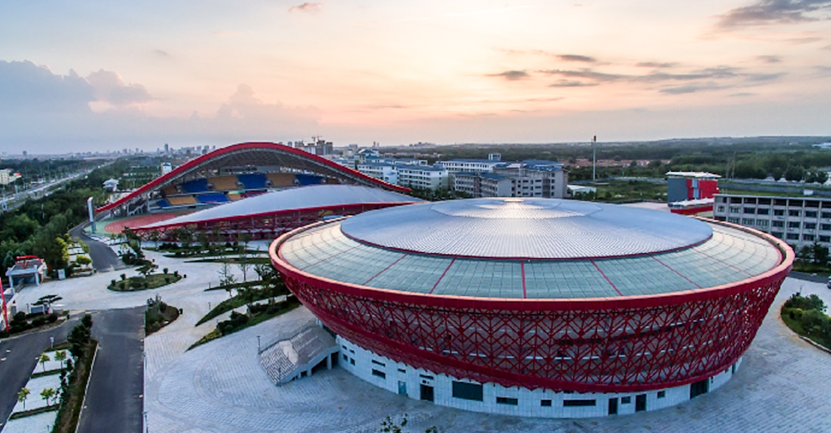 幕式而建,由一座一萬人左右的體育場和一座3500 人左右的體育館組成。兩棟建筑之間為
