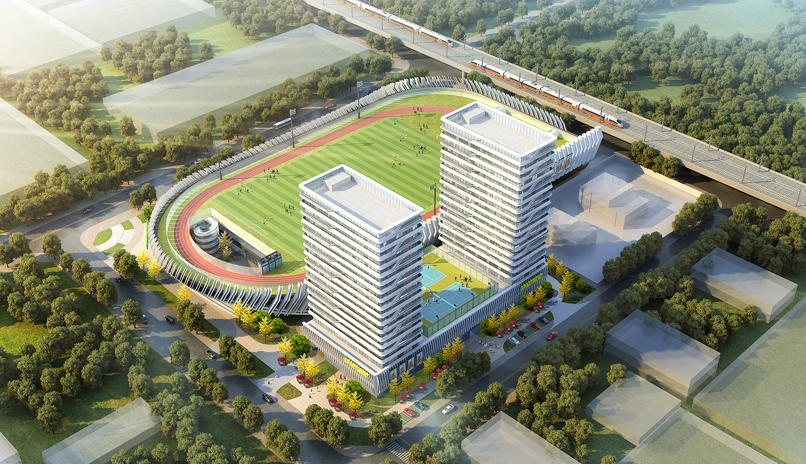 本項(xiàng)目提取高鐵動(dòng)車和海浪浪花的概念,用白色鋁板陣列與變化塑造出體育綜合體泛著浪花的海洋波浪造型。同時(shí)利用動(dòng)車動(dòng)感流線的造型設(shè)計(jì)出公寓的整體方案。海浪與動(dòng)車流線結(jié)合,不僅代表了青島的特色,更是詮釋了積極動(dòng)感的體育精神。將景觀引入建筑,以景觀打造形象,形成未來(lái)綜合體發(fā)展模式。