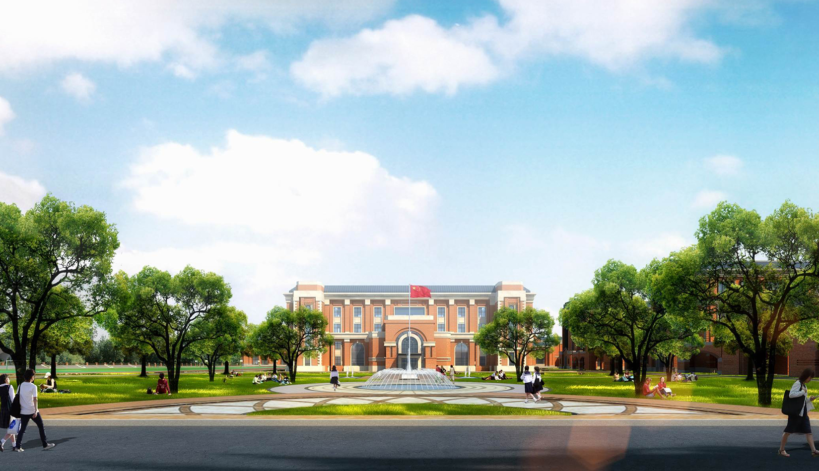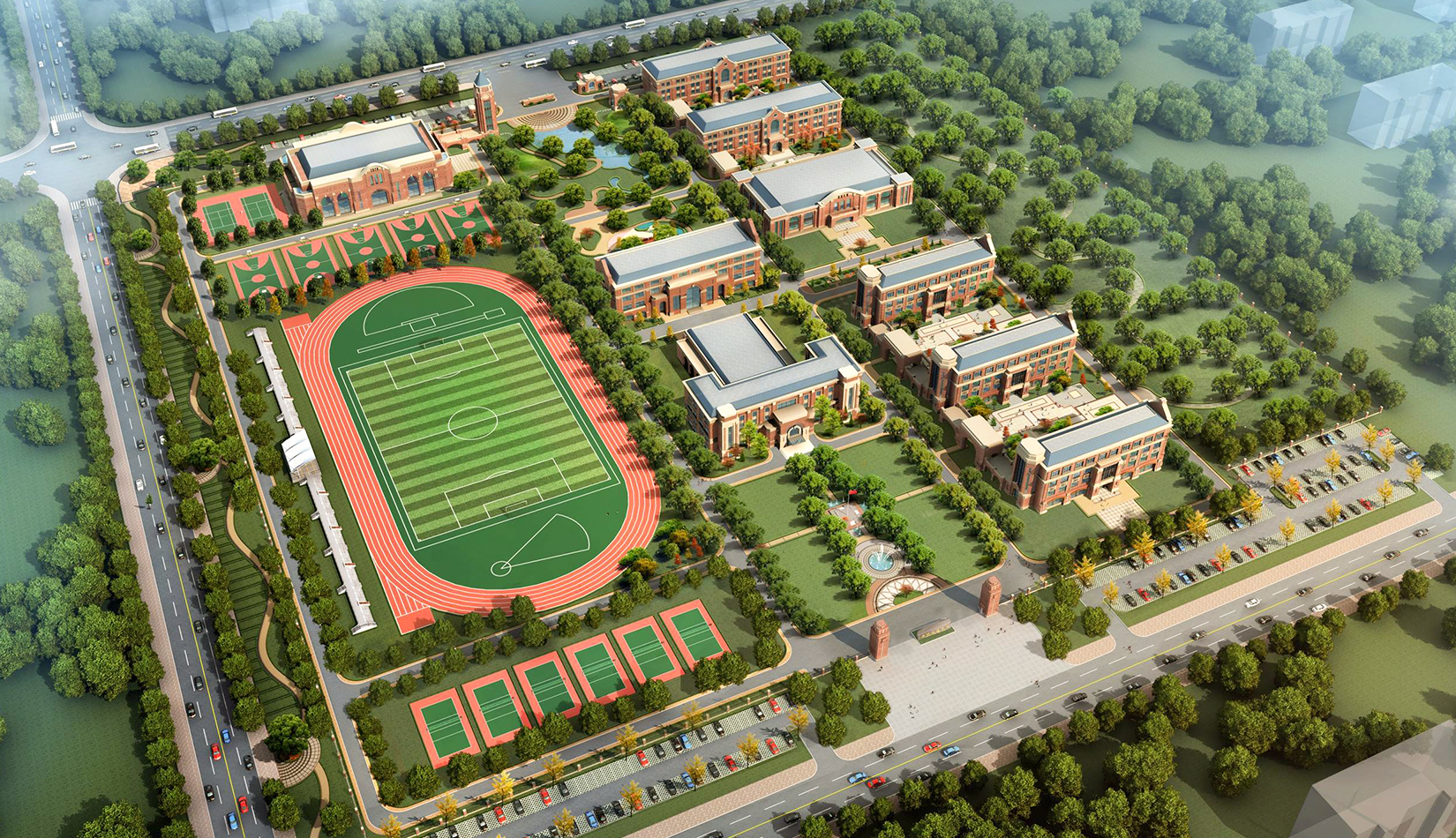 分區(qū)設(shè)計(jì)上,采用了“前場(chǎng)后園”的設(shè)計(jì)手法。前區(qū)以教學(xué)區(qū)為主,圍繞中心圖書綜合樓形成前區(qū)禮儀性廣場(chǎng),同時(shí)以中軸對(duì)稱為原則,體現(xiàn)了教學(xué)的嚴(yán)肅性與秩序性;各個(gè)教學(xué)單元以年級(jí)、功能就近布置為基本原則,以中國傳統(tǒng)的“院落”形式進(jìn)行組合,后院生活區(qū)借鑒了“山水園林”的布局手法,結(jié)合中心景觀,進(jìn)行自由化布局,達(dá)到景入園中、人在景中生活場(chǎng)景,使學(xué)生在學(xué)習(xí)之余,得到充分的放松。