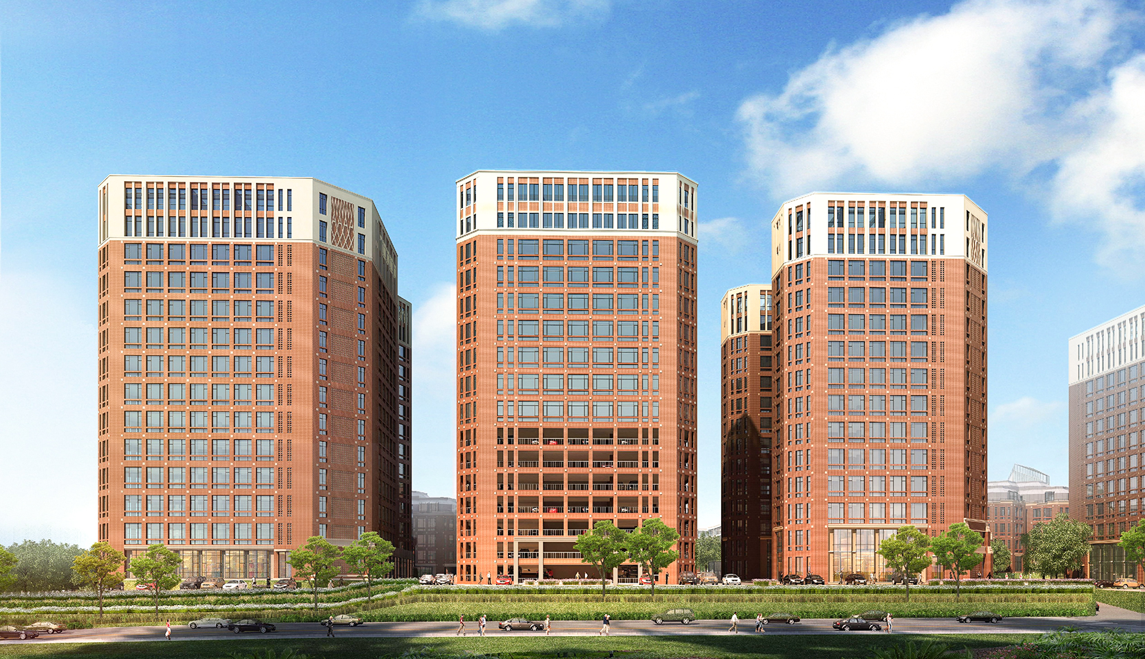 該項(xiàng)目規(guī)劃采用傳統(tǒng)規(guī)則式 “十字型” 營造手法,體現(xiàn)井然有序、尺度宜人的空間。