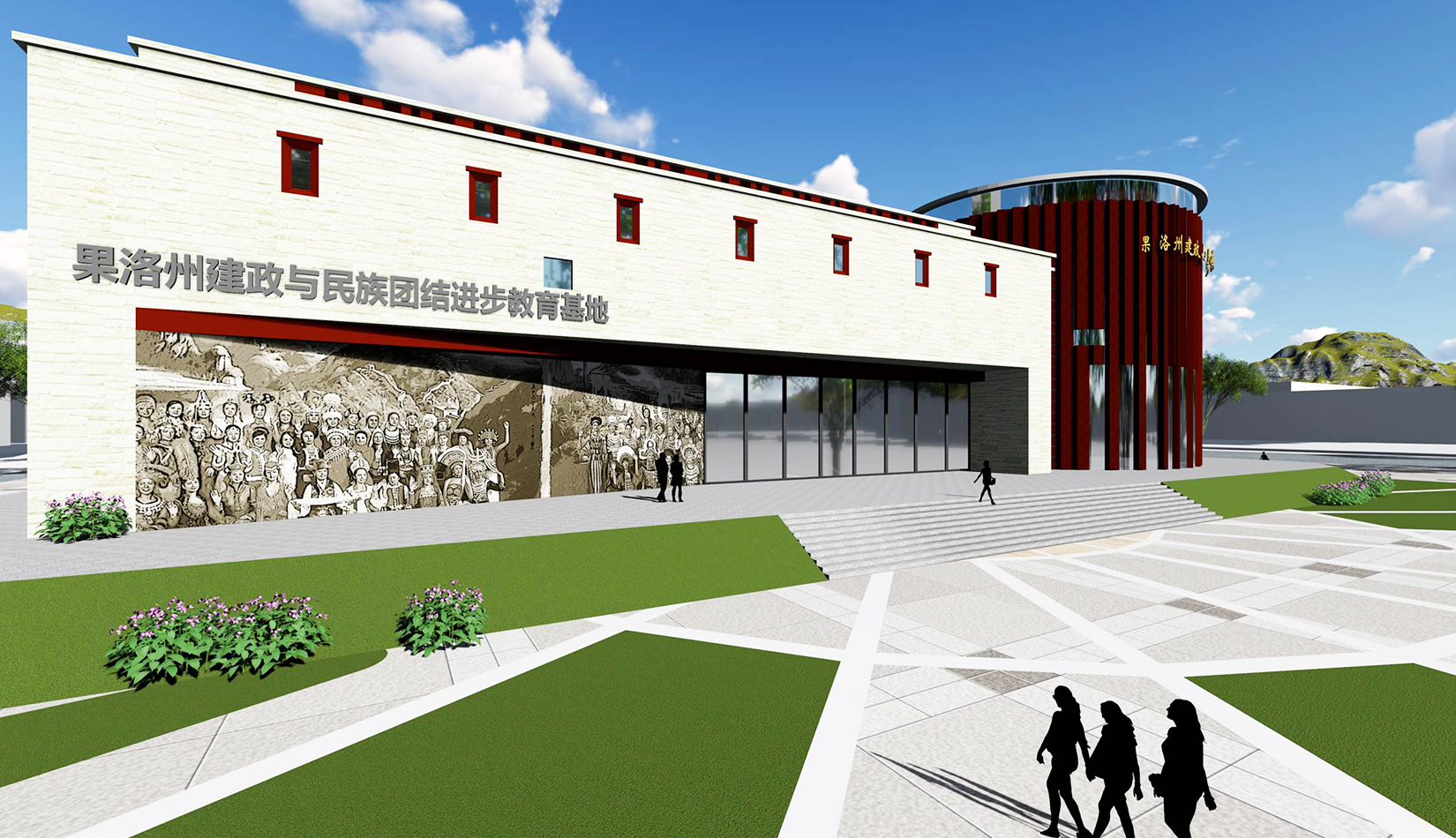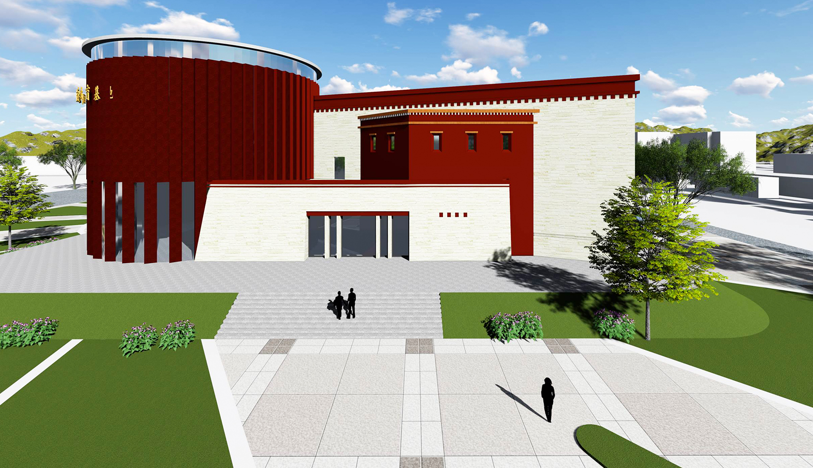 設(shè)計(jì)造型整體為中心聚攏的形態(tài),圓形體塊是建筑的核心,象征著黨的領(lǐng)導(dǎo),各分支體塊象征著分布在果洛的各個民族,體現(xiàn)出各民族團(tuán)結(jié)一心,同心向黨,在黨的領(lǐng)導(dǎo)下團(tuán)結(jié)一致、共同奮斗;另一方面,圓形體塊與各分支體塊的簇?fù)黻P(guān)系也象征著各民族緊密團(tuán)結(jié),永不分離。