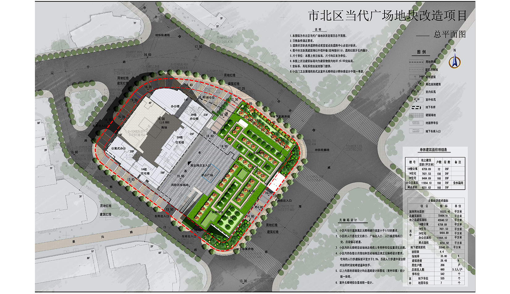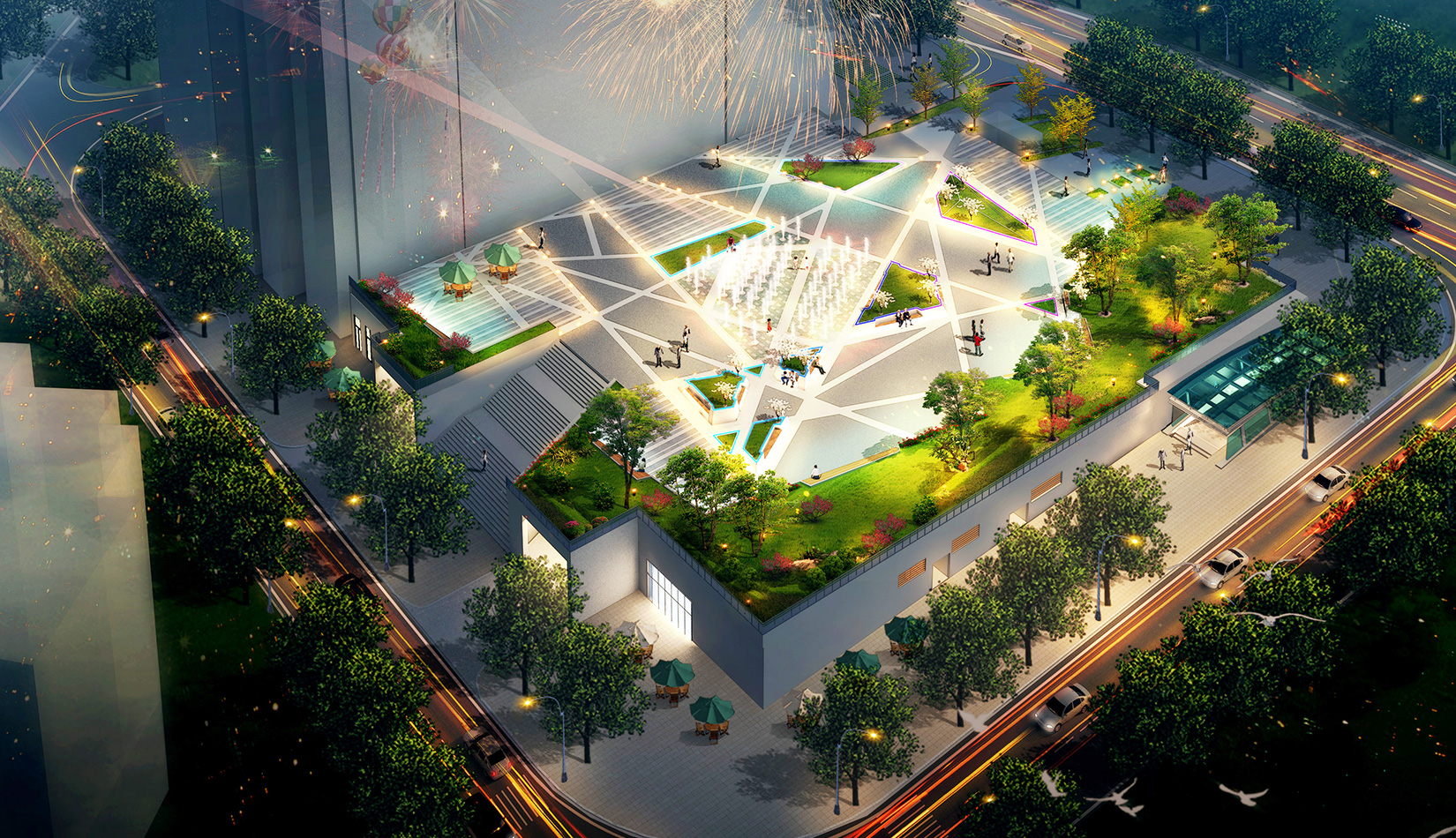 結(jié)合臺東商圈地理位置,在建筑南側(cè)設(shè)臨街廣場,考慮視線的通透與遮擋,與帶狀綠地自然的溝通,達到廣場、建筑、景觀的完美結(jié)合。