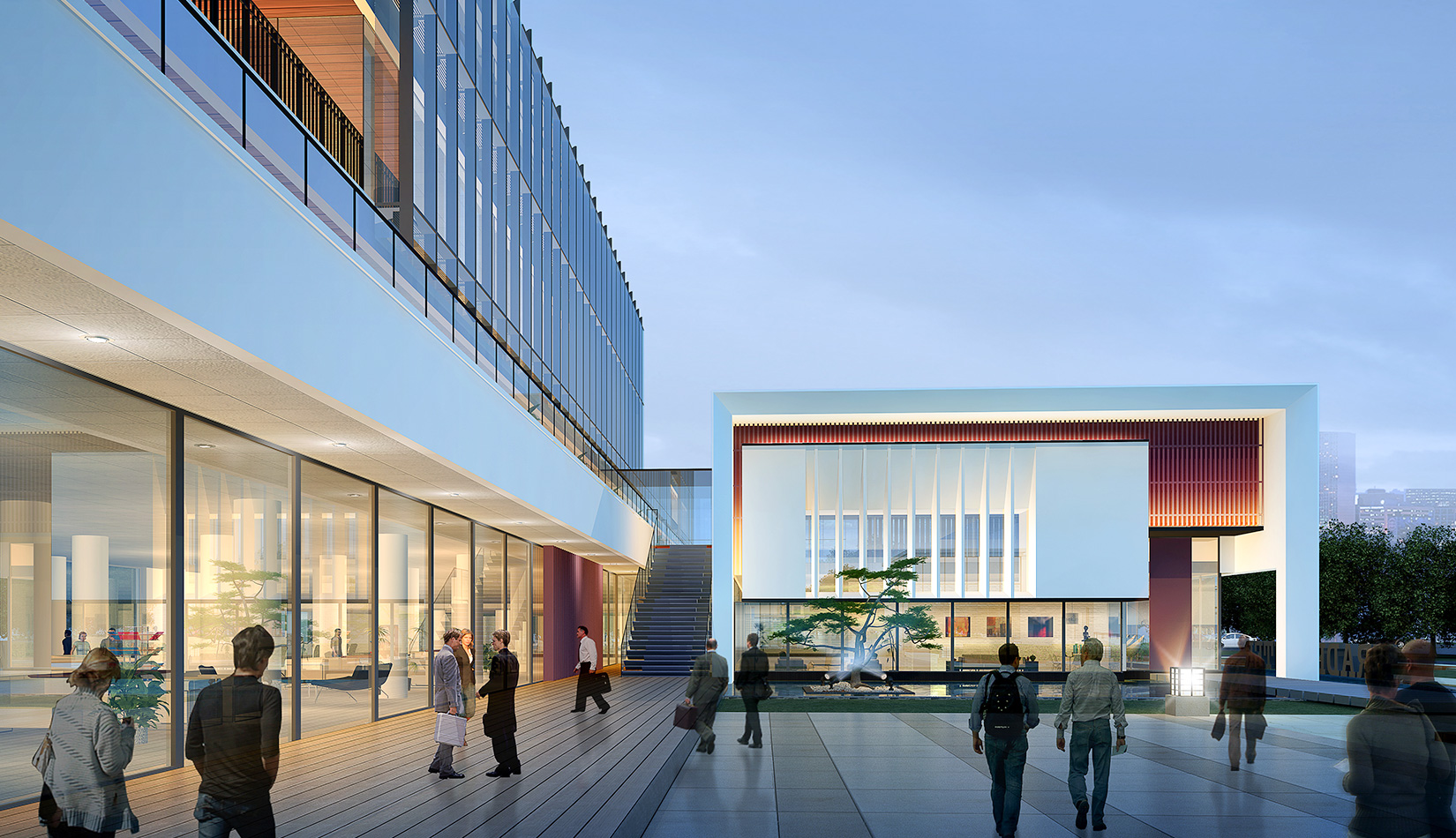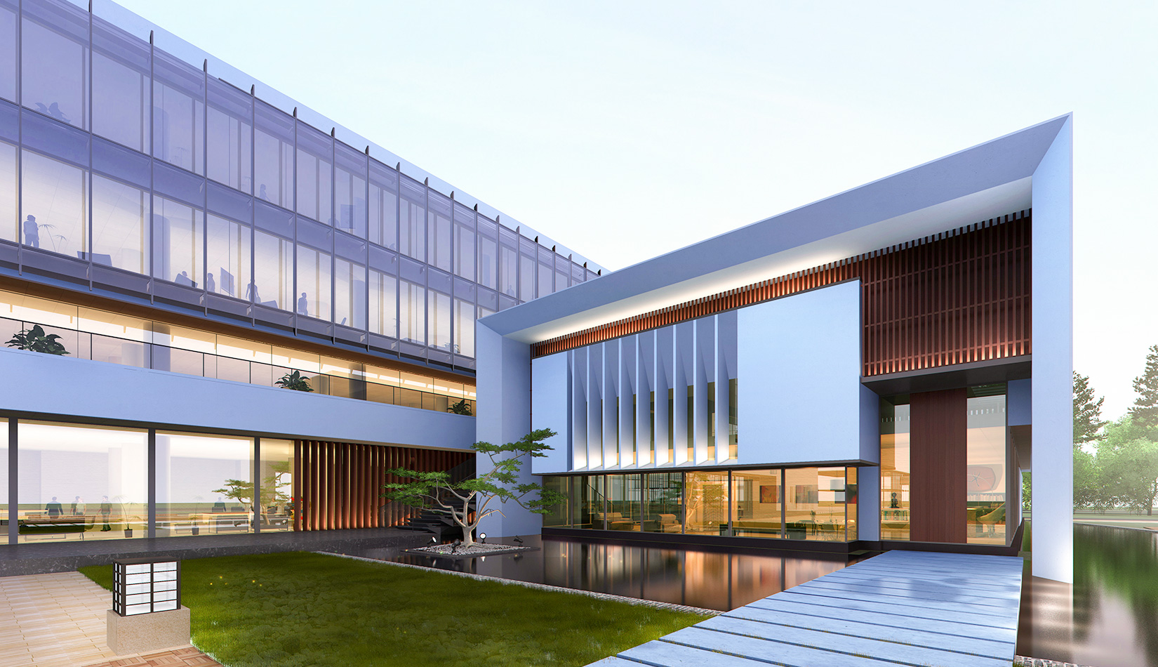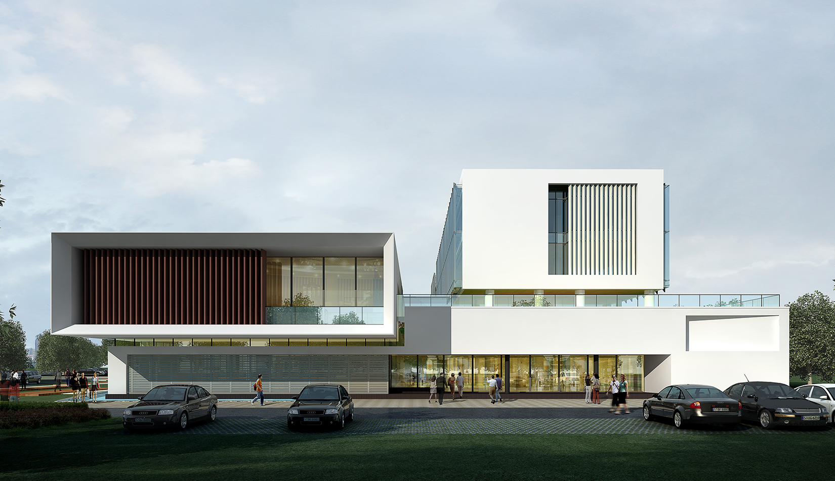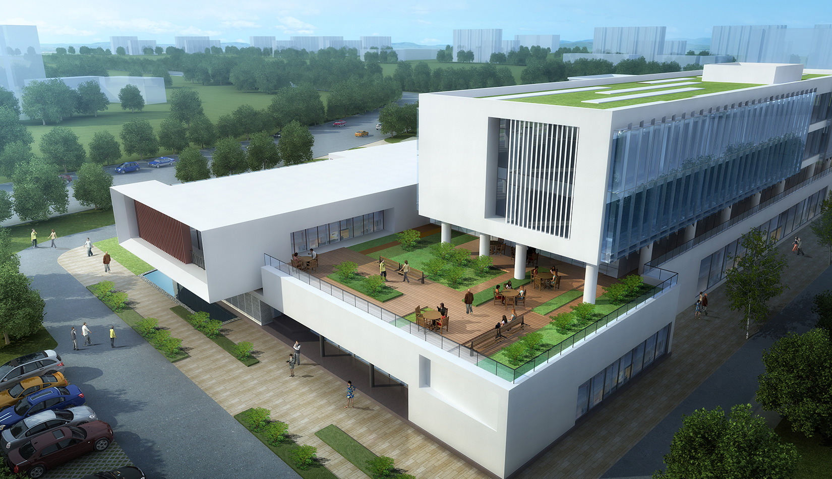 作為中韓貿(mào)易合作區(qū)一期啟動區(qū)的重點(diǎn)項目,其承擔(dān)著對外展示以及為后續(xù)發(fā)展提供服務(wù)平臺的功能。因此設(shè)計力求穩(wěn)重大氣,以4 層的體量打造出地標(biāo)性的建筑。設(shè)計運(yùn)用簡潔的外形、寧靜的色彩,外立面以白色涂料和木格柵為主,尊重自然,打造一種平和寧靜的感覺。在空間設(shè)計上通過共享空間、上人露臺和一層大平臺,創(chuàng)造出舒適宜人的工作環(huán)境;在技術(shù)上通過地源熱泵、呼吸式幕墻、雨水收集等的應(yīng)用,實現(xiàn)建筑的綠色節(jié)能環(huán)保。
