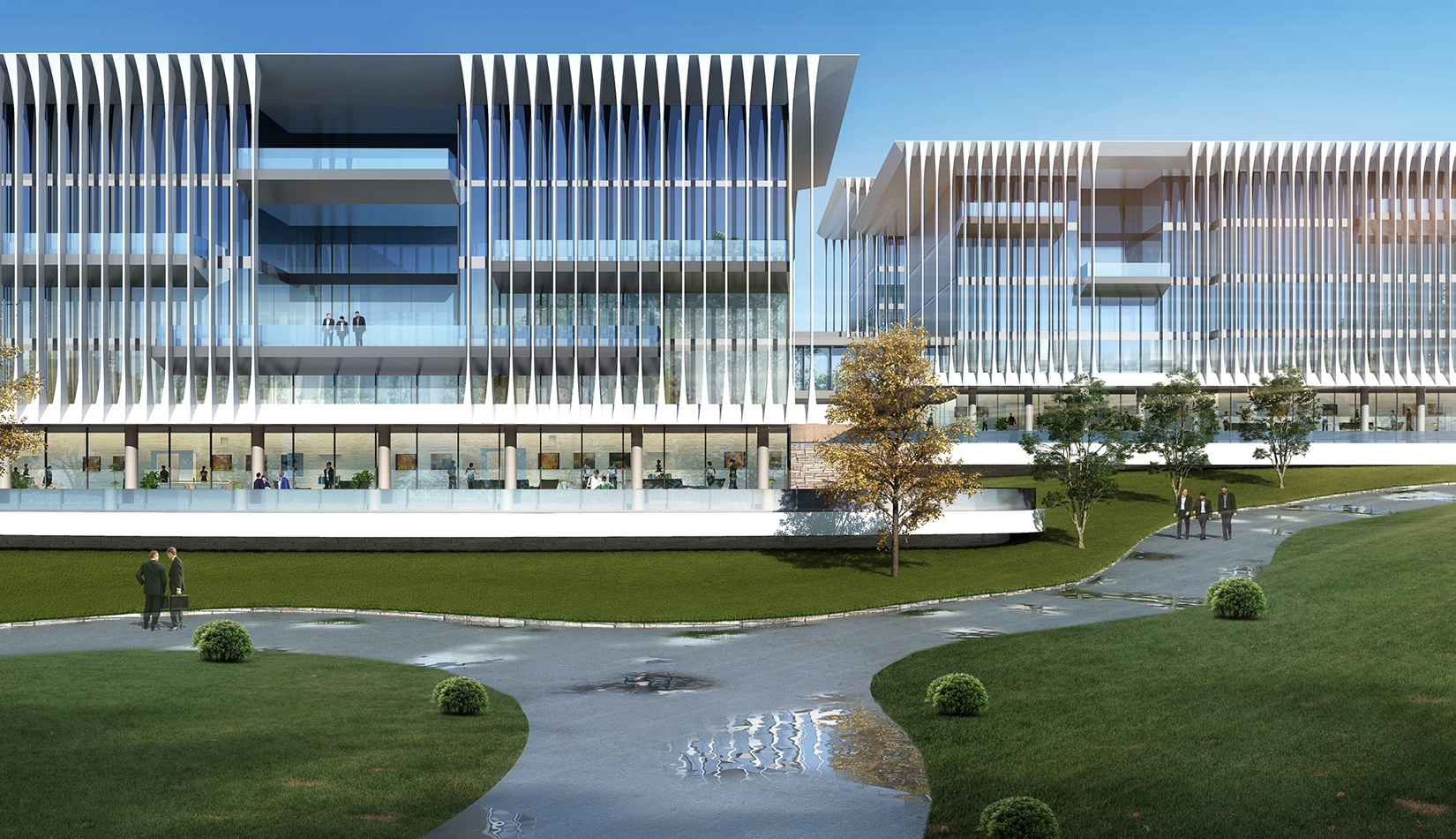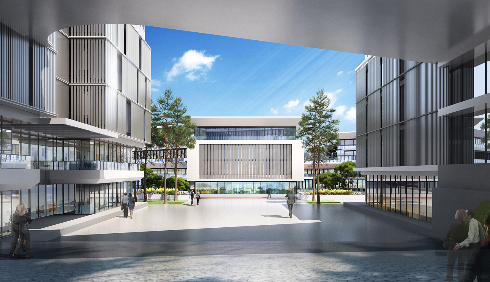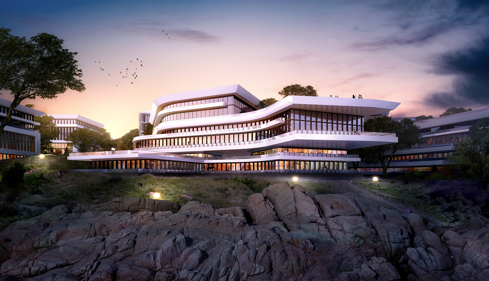建筑立面采用疏密有致的格柵化立面,凸顯了預(yù)警基地的嚴肅性;白色流線型屋頂順應(yīng)地勢,給建筑賦予現(xiàn)代的海洋氣息。不同的建筑功能合理布局,沿海建筑采用退臺的建筑手法,沿海岸線立面生動活潑。