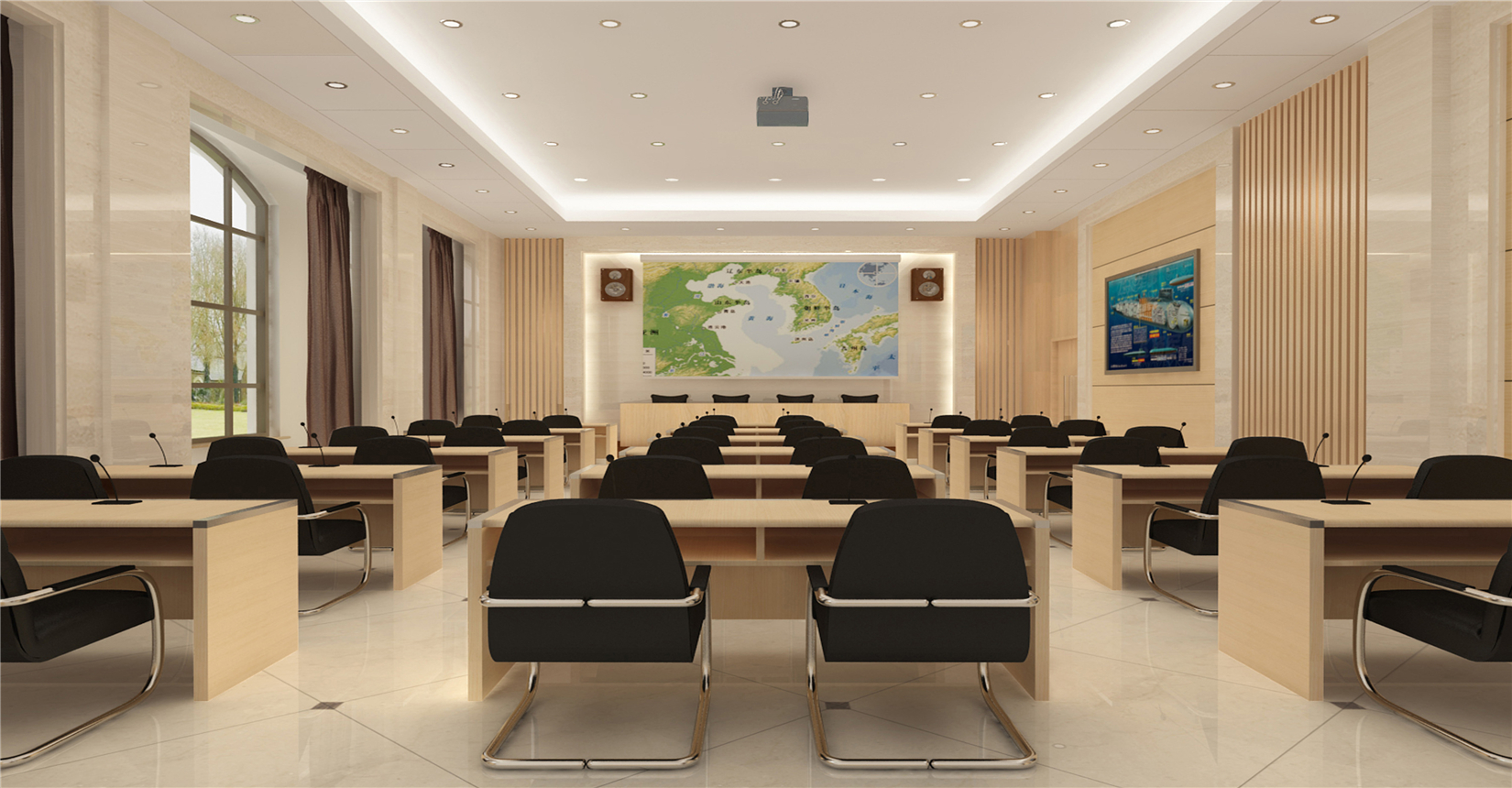 本項目空間服務(wù)于學(xué)院接待與學(xué)術(shù)交流目標(biāo),室內(nèi)通過流通的社交空間構(gòu)成主線,滿足現(xiàn)代學(xué)術(shù)空間高效、便捷溝通、智能服務(wù)等需求,整體提升了潛艇學(xué)院的對外社會形象。